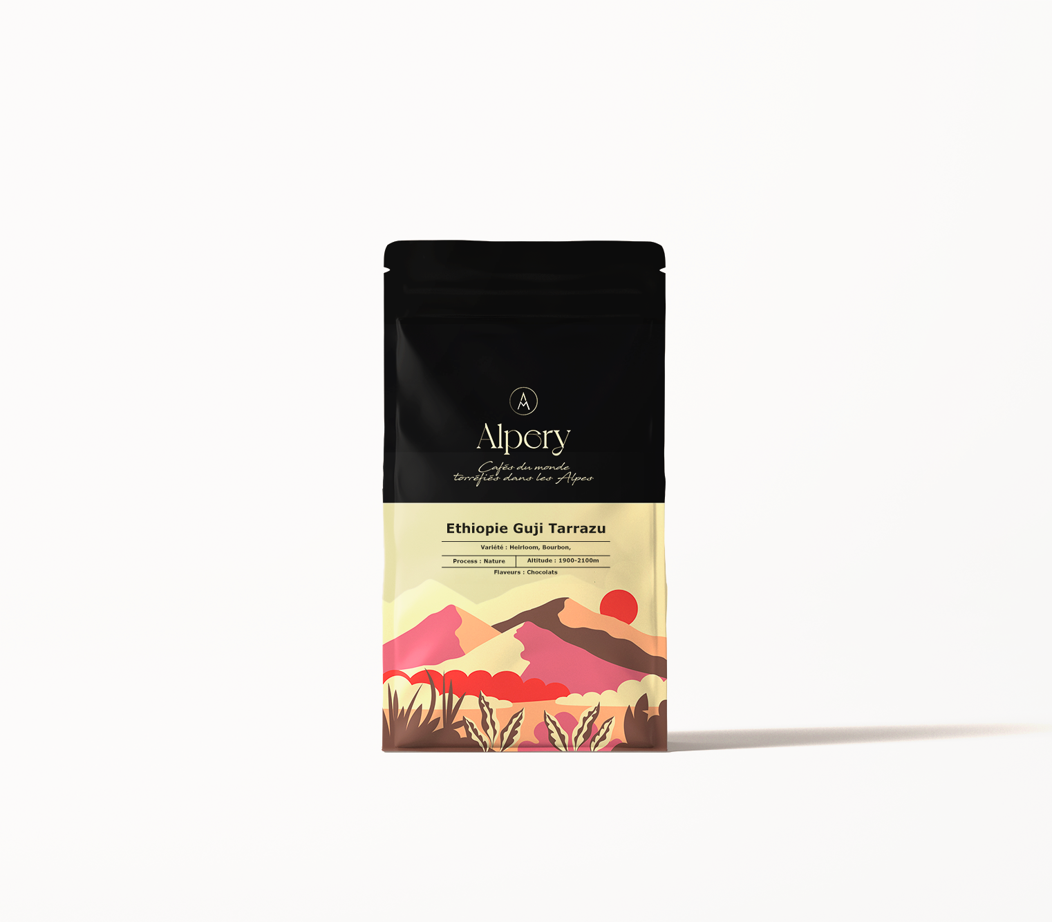 Le café Guji d'Éthiopie, cultivé en haute altitude et séché naturellement, offre une tasse équilibrée aux saveurs envoûtantes de fruits rouges, agrumes, chocolat et melon, incarnant l'excellence des cafés de spécialité.